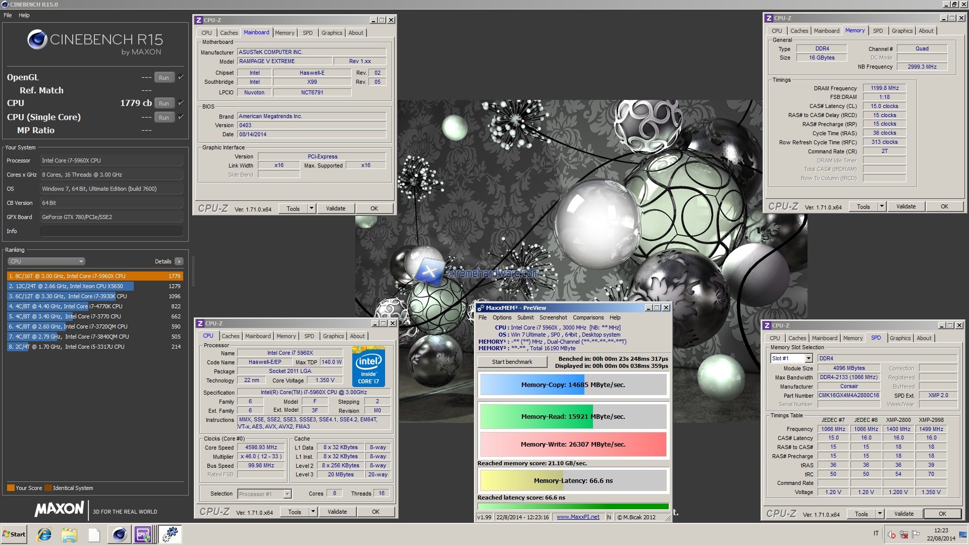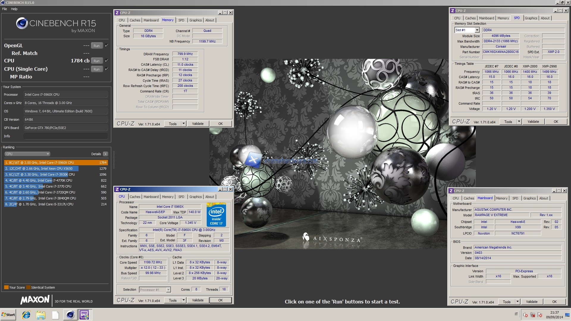 Ovviamente, dato il settore a cui è indirizzata la Rampage V Extreme non potevamo esimerci dall’eseguire test in overclock, limitatamente alle possibilità offerteci dal raffreddamento a liquido, per spingere la frequenza della CPU Core i7 5960X ben oltre la soglia di sicurezza dichiarata da Intel. Il tipo di test scelto per l’efficienza nello stressare il processore è CineBench nell’ultima release disponibile R15. Il test eseguito ovviamente è quello CPU multithreading che spalma su tutti i core logici il calcolo del rendering dei solidi rappresentati nella scena. Come frequenza massima di target per il cosiddetto Daily Use che consideriamo un giusto equilibrio tra temperatura raggiunta dal processore e voltaggio richiesto è di 4600MHz. Il punteggio ottenuto è puramente simbolico volto a verificare sia la stabilità della piattaforma che la frequenza delle memorie impostate a 1600 MHz che si è scelto di non overcloccare in quanto oggigiorno qualsiasi tipo di RAM può reggere tale frequenza e timings.