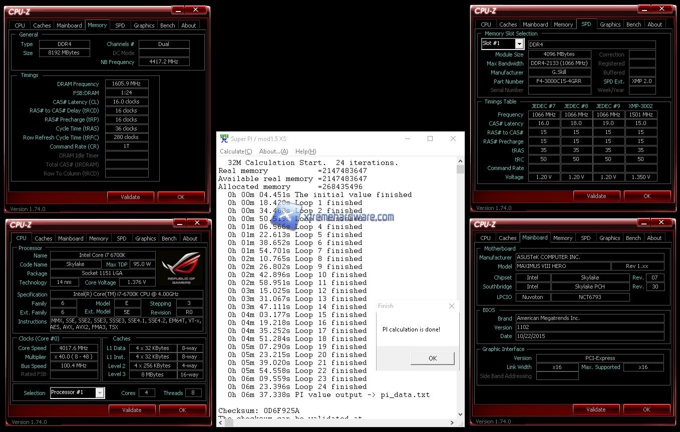 La Maximus VIII Hero presenta due profili di overclock automatico per la CPU Core i7 6700K, denominati TPU I e TPU II. Quest'ultimo propone come frequenza target per il cosiddetto Daily Use (considerando un giusto equilibrio tra temperatura raggiunta dal processore e voltaggio richiesto) di 4600MHz ma forte del vantaggio offerto dal processo produttivo introdotto da Intel a 14nm possiamo asserire che a chi capita una CPU fortunata nel periodo invernale la si può tenere anche a 4700 MHz. Comunque, il punteggio ottenuto è frutto dell’insieme processore/memorie per riuscire a dare il massimo senza perdere in stabilità. Nel nostro caso, grazie ad una CPU particolarmente fortunata, abbiamo potuto effettuare tutti i test ad una frequenza di 4800 MHz con 1,4V di Vcore. Per le memorie potevamo spingerci oltre, ma per l’utilizzo quotidiano abbiamo preferito non esagerare anche con i voltaggi e fermarci alla frequenza di 3212 MHz. Prossimamente vi proporremo la recensione del kit della G.SKILL utilizzato. Ecco a seguire gli screen che si commentano da soli e che se confrontati a pari frequenza a quelli pubblicati sul noto sito di Overclock Hwbot.org possiamo asserire che la Maximus VIII Hero alla frequenza di 4800 MHz si è comportata da vera fuori classe riuscendo a tirare a dovere il comparto CPU e RAM.