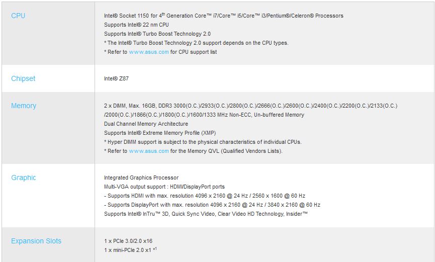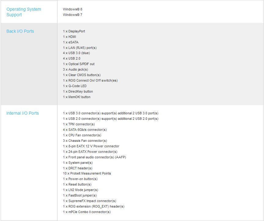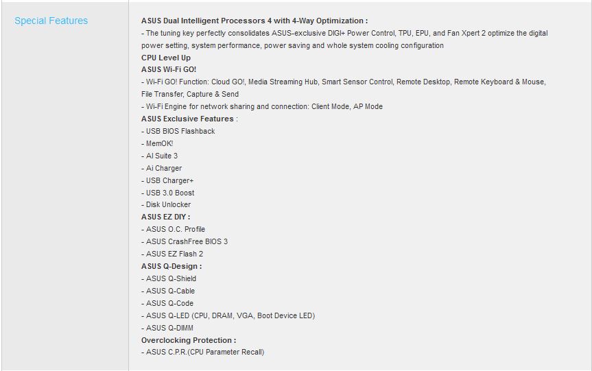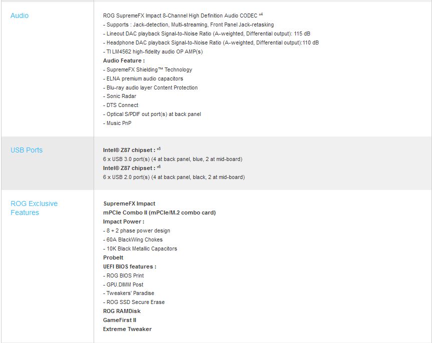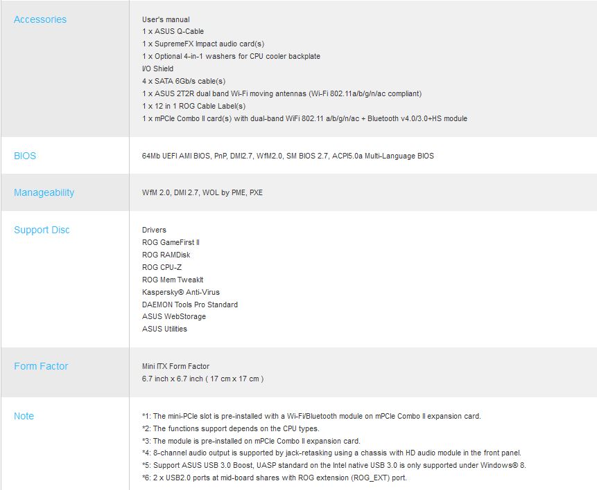 Di seguito gli screen relativi alle specifiche di prodotto, disponibili anche sul sito del costruttore. E’ davvero interessante notare la completezza delle feature della M6I. ASUS ha sempre optato per una politica di differenziazione tra gamers e overclockers, destinando ai primi i modelli “Formula”, dotata di sezione audio dedicata, e ai secondi le “Extreme”, che racchiude tutte le migliori tecnologie utili per l’overclock estremo.  La Impact, in neanche la metà dello spazio, coniuga le funzionalità di entrambe!